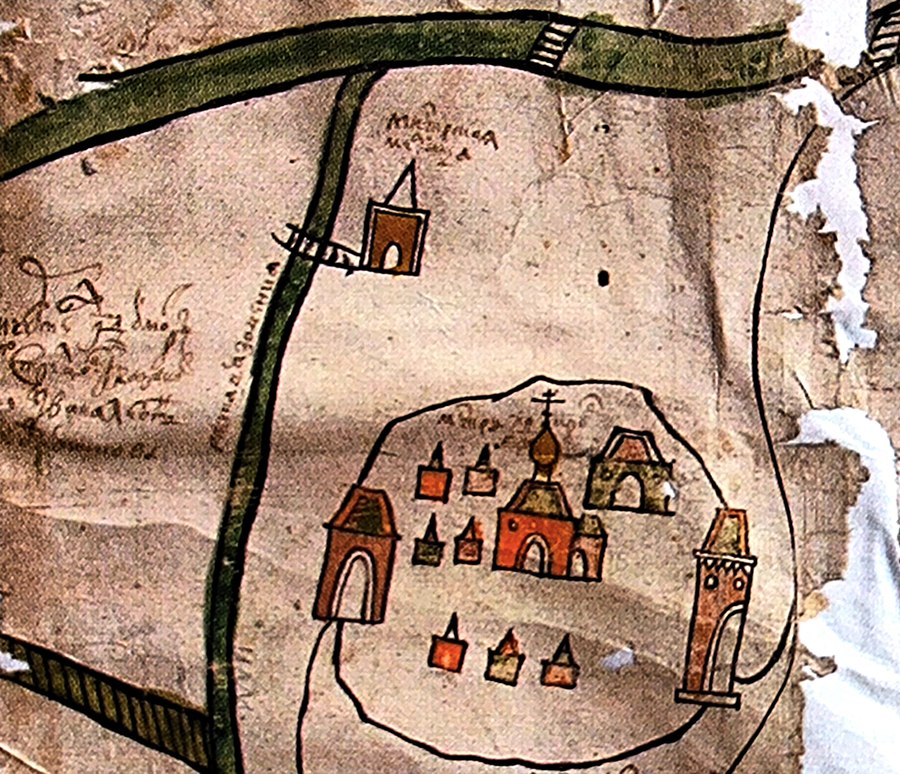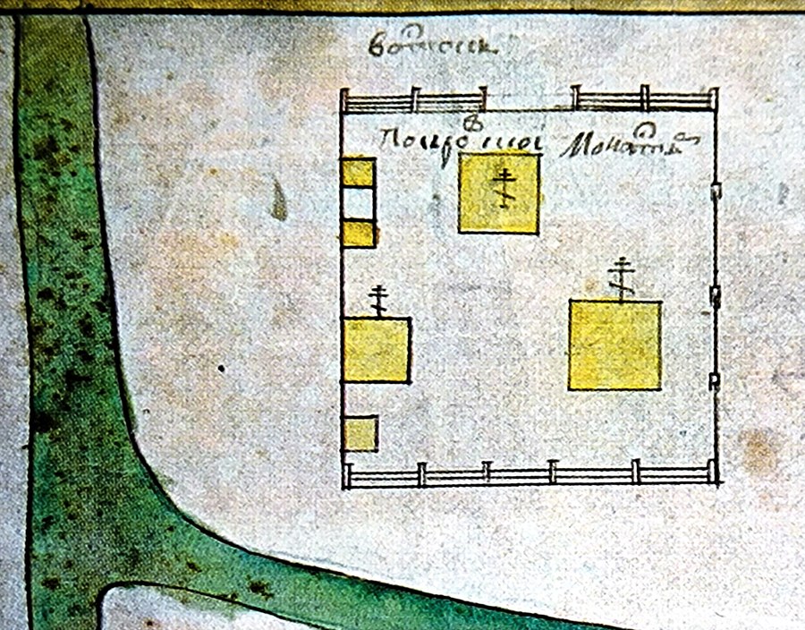 К этому времени – 1673 г. – относится сохранившийся в фондах РГАДА чертёж города Данкова и прилегающих окрестностей, на котором показан Покровский монастырь, окружённый деревянной оградой с двумя башнями и воротами. Судя по чертежу, в обители тогда находились церковь, семь небольших келий и две постройки покрупнее, вероятно, трапезная и келья настоятеля. В устье реки Вязовни у моста через речку стояла монастырская мельница [10].