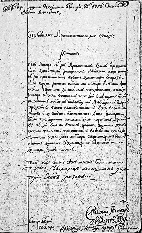 Однако прожить «на покое» в Покровской обители владыке Гавриилу было суждено недолго. В конце января 1753 г. в Святейший Синод поступило доношение от епископа Рязанского Димитрия, в котором сообщалось, что 16 января «…во втором часу дня имеющийся в оном Покровском монастыре на обещании Преосвященный Гавриил, архиепископ бывший Великоустюжский, от сего временного жития отыде в вечное блаженство» [28]. Здесь же сообщалось, что после смерти Владыки остались «всякие пожитки», для описи и опечатывания которых был назначен подпоручик Степан Игнатьев Абаринов. Находившийся в Данкове при подушном сборе подпоручик вместе с игуменом Покровского монастыря Филиппом осмотрел имеющиеся в кельях почившего архиерея и кладовой комнате вещи и описал их, кроме трёх сундуков с «пожитками», которые были опечатаны воеводской канцелярии и игумена Филиппа печатями. После чего при «оных Его Преосвященства пожитках, дабы тем пожиткам от кого похищения и траты не последовало, имеется караул» [29].